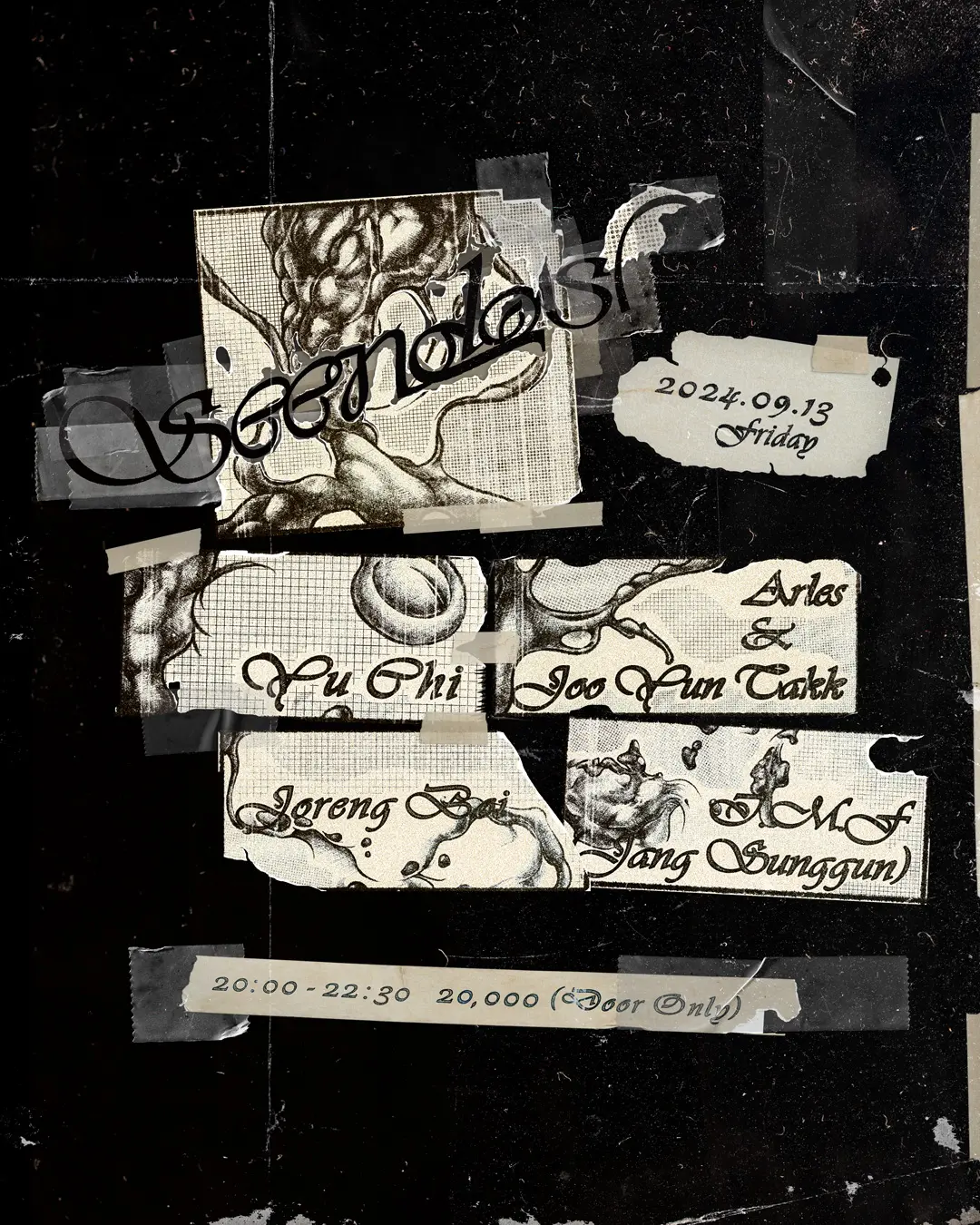 Promotional graphics for a sound performance event linked to Seoul/Cologne-based sound artist Joreng's exhibition, hosted by Seendosi.